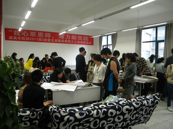 结合学院专业特点,我们在教职工之家设置了3张大的专业课桌。老师们可以在休息室一起与同学们评图、交流、讨论,以此为师生们提供一个别样的交流沟通空间。