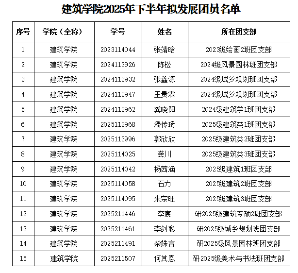 根据《中国共产主义青年团章程》有关规定,按照《关于加强新形势下发展团员和团员管理工作的意见》和《中国共产主义青年团发展团员工作细则》要求,经学生个人申请、团支部教育培养考察、二级团组织审核团支部推荐意见和相关材料,拟推荐张靖晗等15名同学为本次发展团员对象,具体名单见下表。