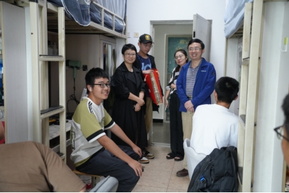 走访过程中,胡书记从思想政治、学习状态、饮食起居、校园安全、学业规划等各方面关心了解新生同学们对大学的适应情况。学院领导、老师们与同学们进行亲切交谈,并仔细查看宿舍的各种设施是否完善,提醒同学们要注意宿舍卫生,做好个人健康防护,强化安全意识和自我保护意识。