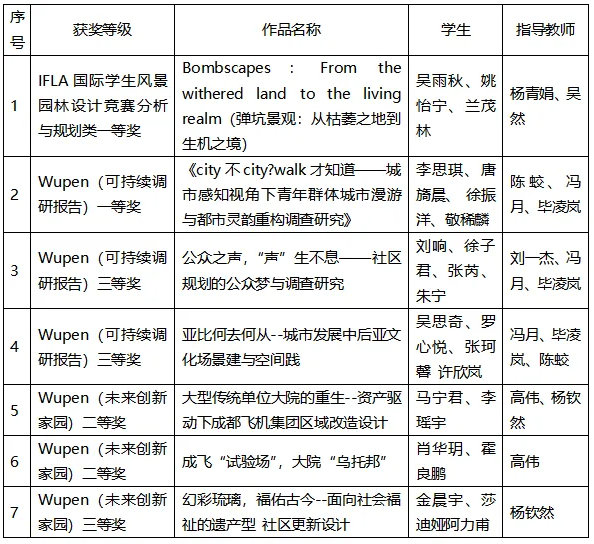学子在国内外竞赛中表现优异,捷报频传。在IFLA国际学生风景园林设计竞赛中荣获分析与规划类一等奖。这是我校首次在风景园林专业最高等级国际赛事中获得一等奖,实现了历史性的突破。同时在2024WUPENiCity学生作业国际竞赛中荣获一等奖1项、二等奖2项、三等奖3项、提名奖8项的好成绩。