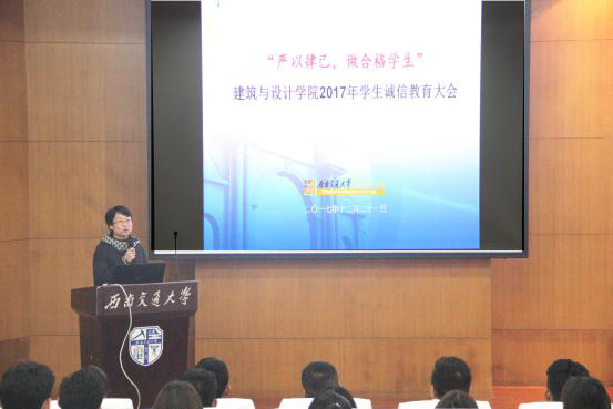 “严以律己,做合格学生”的2017年学生诚信教育大会在图书馆一号报告厅顺利召开,大会邀请学院党委副书记刘一杰担任主讲,学工组全体辅导员及学院2017级新生级部分其它年级的同学代表参加会议,刘野主持大会。