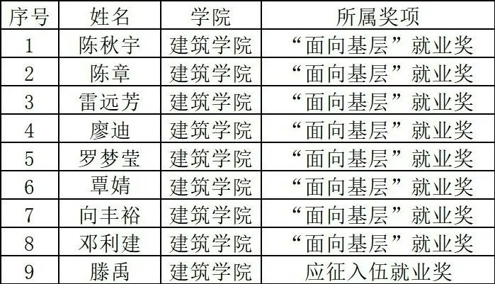 共有9名优秀毕业生凭借在“面向基层”就业和“应征入伍”就业方向中的出色表现,荣获就业奖,获奖名单如下:陈秋宇、陈章、雷远芳、廖迪、罗梦莹、覃婧、向丰裕、邓利建、滕禹。