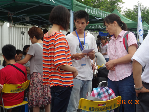 今天有不少同学都是独自一人从很远的外省来学校报到的,这样独立的学弟学妹让人敬佩。而另外还有一部分同学就是全家齐上阵,让迎新点非常的热闹,充满生气。有个来自重庆的同学是由妈妈,爷爷还有表弟陪同前来的,一说到孙子考上大学,爷爷的嘴就合不拢来,十分自豪。妈妈说12岁的表弟本来是要开学了,但他非要来送哥哥进大学。胖胖的小表弟在一旁十分可爱的说:“哥哥的学校比我的学校大多了,以后我也要来这儿读书。”