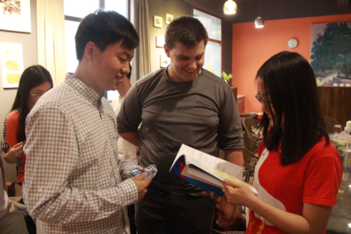 学院党委栗民副书记、王俊老师及学生与Nichoias老师欣赏学院本科生刊物《步行街》