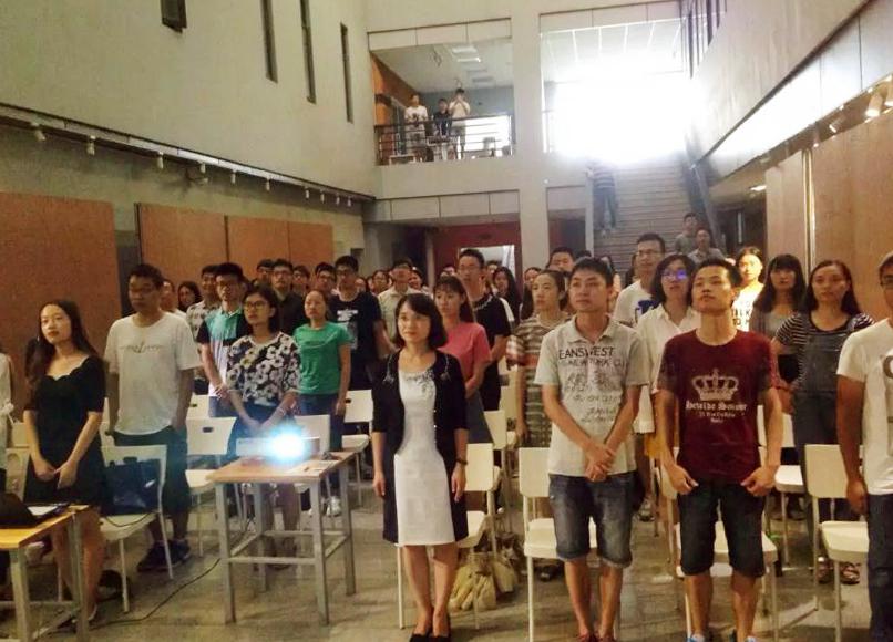 2015年9月3日上午10时,建筑与设计学院师生党员于学院中庭观看纪念抗日战争暨世界反法西斯战争胜利70周年阅兵仪式。当电视大屏幕上传来李克强总理宣布全体起立时,大家迅速站立,与转播的画面一同高唱起国歌,向伟大的祖国致以最崇高的敬意。