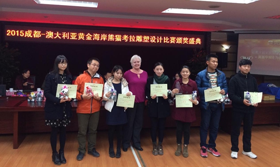 美术系黄焰微同学的作品获得二等奖,闫腾佳、侯钱和周瀛瀛同学的作品分获两项三等奖。四川师范大学校长丁任重、成都市外侨办副主任卢伟良、澳大利亚驻成都总领事馆副领事共同为中澳双方的获奖团队颁奖。