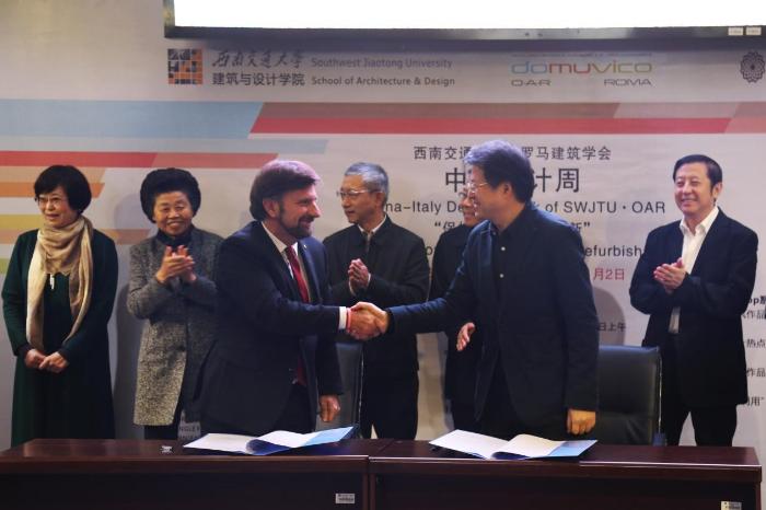 院长沈中伟作为中方代表与罗马建筑学会主席Alessandro Ridolfi签署合作协议,到场嘉宾共同见证了罗马建筑学会成都办公室的揭牌仪式。