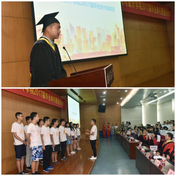 毕业生代表明钰童作为2017届毕业生代表发言,他分享了自己的成长历程,对学院的栽培表示感谢并送给学院衷心的祝福。