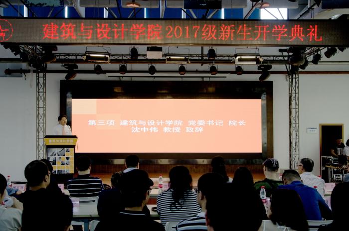 2017级新生在三食堂三楼大学生创业中心隆重举行开学典礼,出席开学典礼的有建筑与设计学院党委书记、院长沈中伟携全体院领导及各系领导、新生班导师、学院各部门负责人,教务老师、团委老师、全体辅导员也到场参与典礼。典礼由学院党委副书记刘一杰主持。