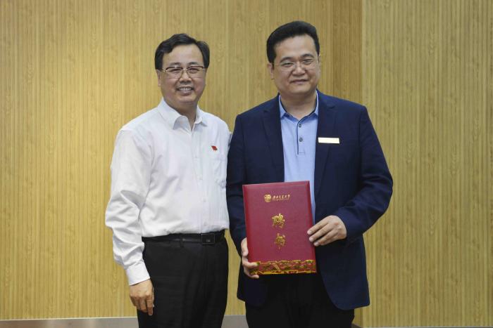 王顺洪首先对刘洪生教授的加盟表示崇高的敬意和衷心的感谢。他表示,刘教授的加盟定将促进艺术类学科加快发展,同时祝刘教授的报告会圆满成功。随后,王顺洪为刘洪生教授颁发了聘书,正式聘请书法家刘洪生为我校兼职教授,并为其佩戴布谷tv