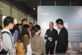 玻璃展厅内,一同见证了Aedas“摩天之城”主题展览的开幕。参观中,纪达夫先生向大家介绍了各个项目,同学们也积极地与纪达夫先生进行了交流。