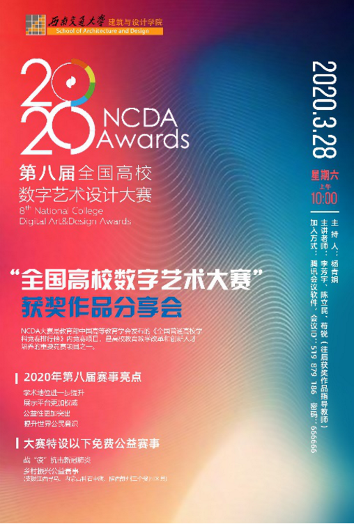 上午10:00点,由杨青娟副院长主持会议,“第八届全国高校数字艺术大赛”获奖作品分享会准时在云端召开,来自全院多个专业的一百多位师生在线登陆会议室,共聚分享会。会议首先邀请了教务处刘朝晖副处长连线指导,权威发布了学校相关鼓励政策。来自产品设计系的李芳宇老师、苟锐老师,视觉传达专业的陈立民老师三位大赛优秀指导老师,分享他们的参赛指导经验,为师生带来了精彩的讲解。首先,李芳宇老师对大赛基本情况、本届赛制及特别比赛单元“抗击新型冠状病毒公益赛事”做了解析,详细介绍了比赛流程及注意事项,对同学们在解题、创作、作品上传、合作组队等方面进行了特色分享。其次,陈立民老师则从优秀案例分析的角度,就作品创意、选题思考、企业命题特点、文案撰写等方面,进行了详尽拆解,将国内外其他重要赛事、主要美术院校线上资源引入此次分享讲解。最后,苟锐老师作为2019年华灿奖一等奖指导老师,带来获奖作品的创作过程分享,并从参赛必杀技、创作逻辑、设计“术”与“道”等角度深入分析,三位老师的讲解精彩纷呈,同时又紧密贴合参赛过程中的实际问题,可谓是为同学们带来了一场赛前的最佳热身。