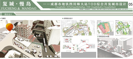 参加答辩的刘天宇、尤晨淳、洪青源、郭容、周睿同学的设计作品《活力生长·成都四川师大站TOD综合开发项目设计》以在大型中心城市中寻求如何提高土地开发强度并整合轨道交通资源为出发点,探究了在一体化开发中功能,尺度,空间三者的有机结合方式。