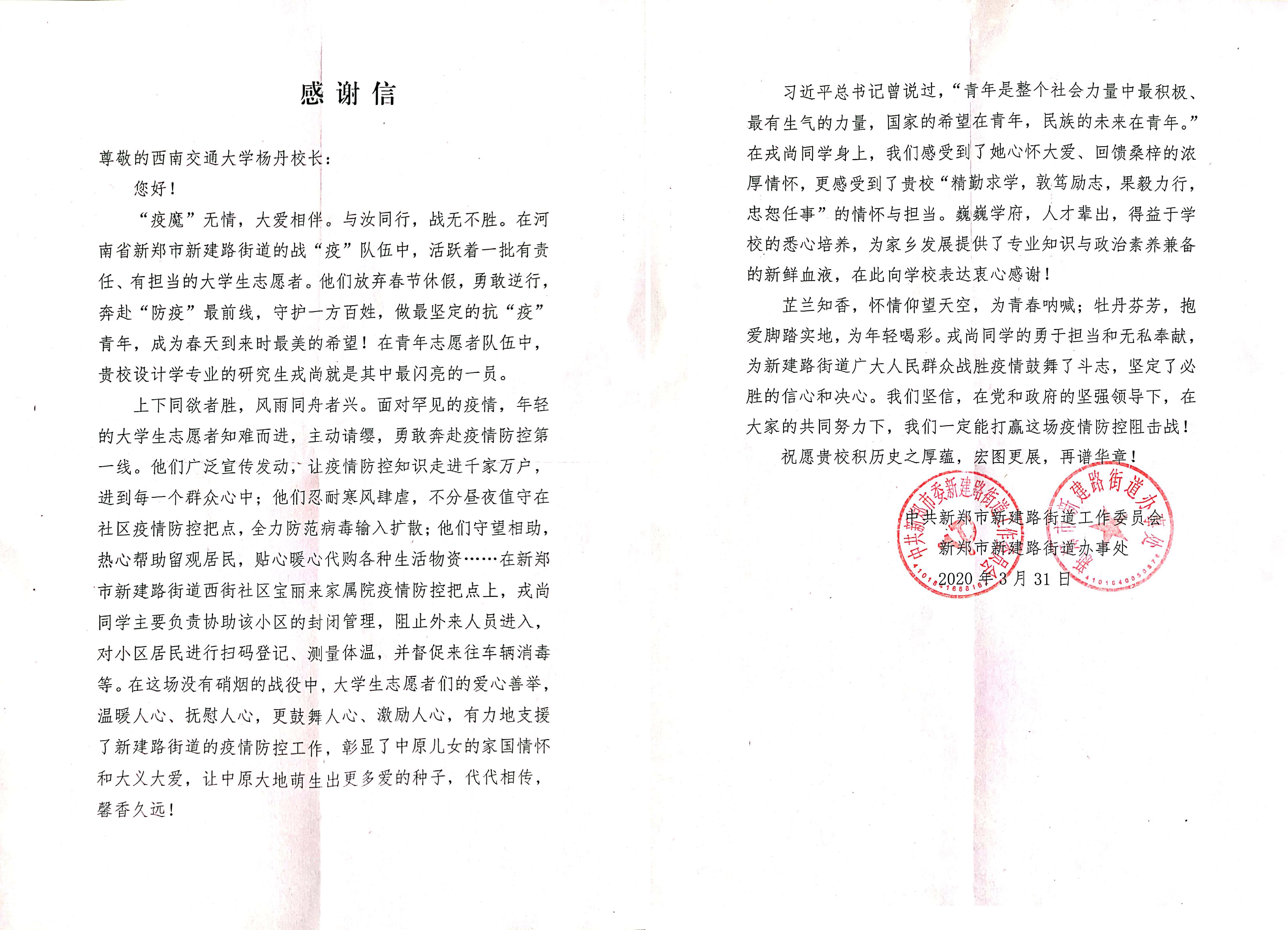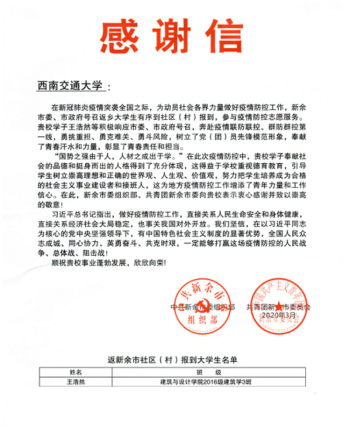 收到来自中共新余市委组织部和共青团新余市委员会的感谢信,来信中对建筑与设计学院2016级建筑学专业王浩然同学在新冠肺炎疫情防控志愿服务中的辛勤付出、对学校和学院长期以来对学生的教育培养表示感谢。