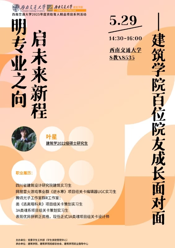 2022级硕士生、腾讯光子工作室群关卡设计师叶星担任主讲,通过剖析建筑学与游戏设计的技能共通性,为迷茫中的学生提供可复制的转型路径。