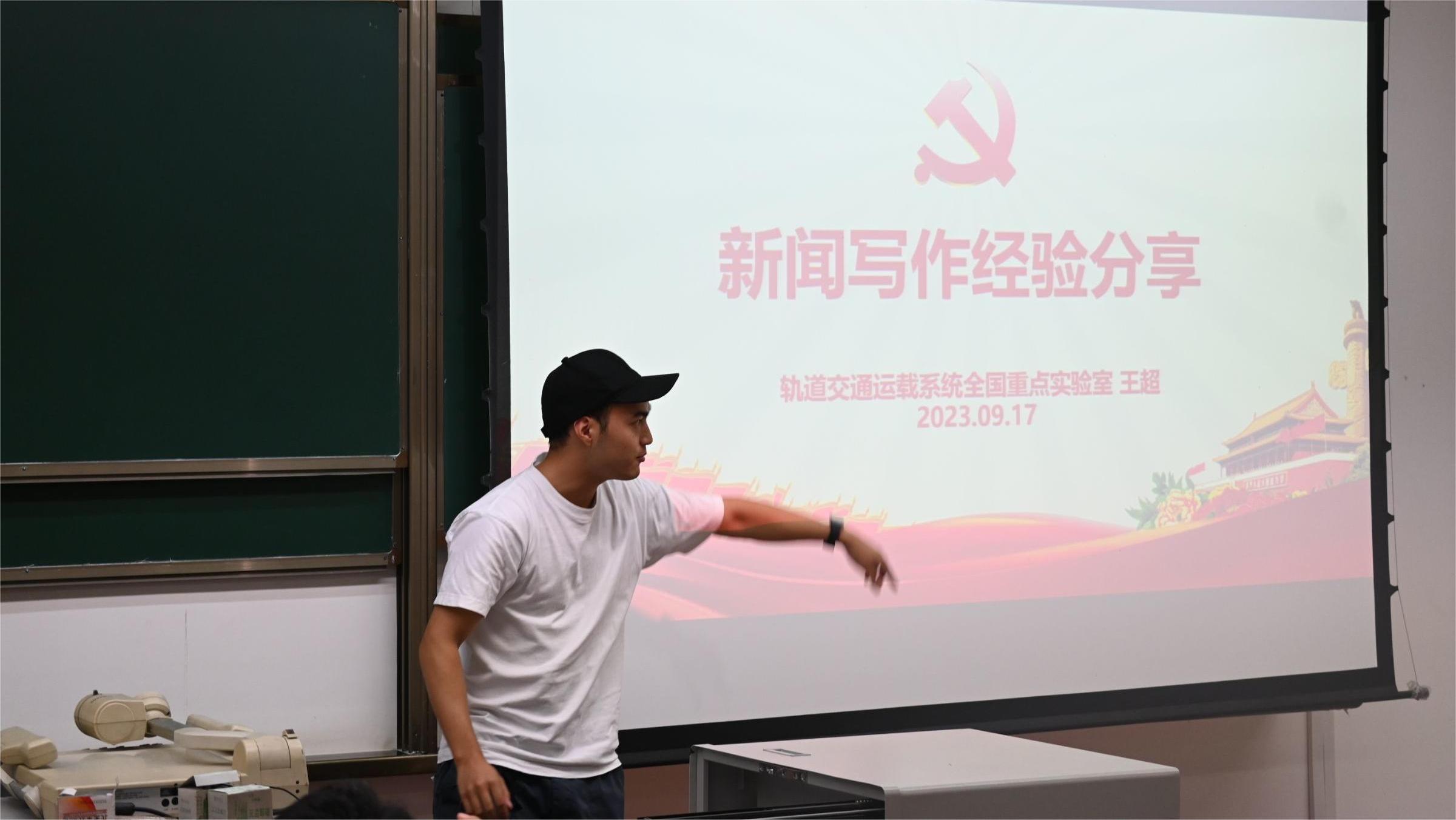 最后,由轨道交通运载系统全国重点实验室的黄勉同学和辅导员王超老师分别对视频拍摄与剪辑、新闻稿撰写进行培训。黄勉同学结合实际经验讲述了视频脚本的制作、视频的拍摄手法以及后期剪辑与配音过程中的常用软件和技巧。