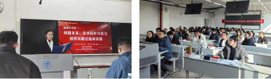 讲座特邀建筑学专业博士研究生王梓与美术与书法专业硕士研究生韦含书作为主讲嘉宾。王梓结合科研实践,系统梳理了英文论文从选题到投稿的全过程;韦含书则详细讲解了求职面试的核心要点与实用策略。在随后的答疑环节中,同学们踊跃提问,现场交流热烈。