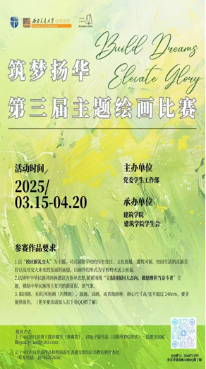 比赛面向全校学生,征集作品涵盖国画、水彩、油画、版画等多个类别。参赛作品紧扣“筑梦扬华”主题,既有描绘校园历史建筑与人文风貌的深情之作,展现交大精神传承;也有聚焦时代发展、描绘民族复兴新征程的宏大叙事,体现了青年一代的责任担当与艺术创造力。