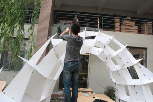 组员团队协作搭建建造模型