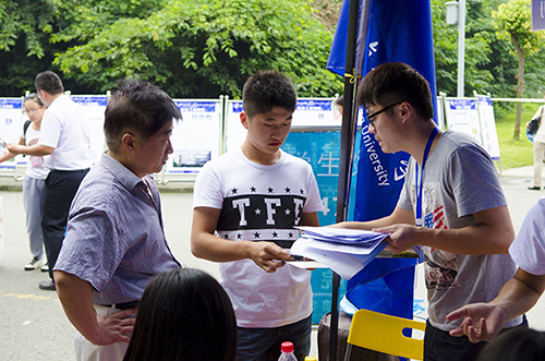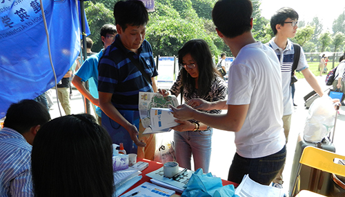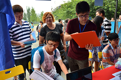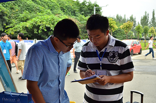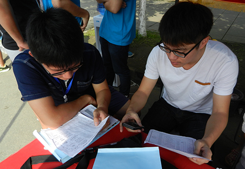 迎新点的班主任与志愿者们正等待着新生们前来报到注册