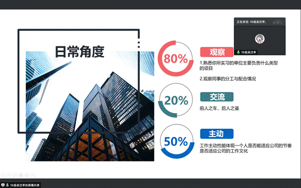 开展了研究生求职实习分享会,分享会由2019级城乡规划班吴汶亭、2018级建筑专硕2班陶婧两位学姐主讲,所有2020级建筑类研究生参加了本次分享会。