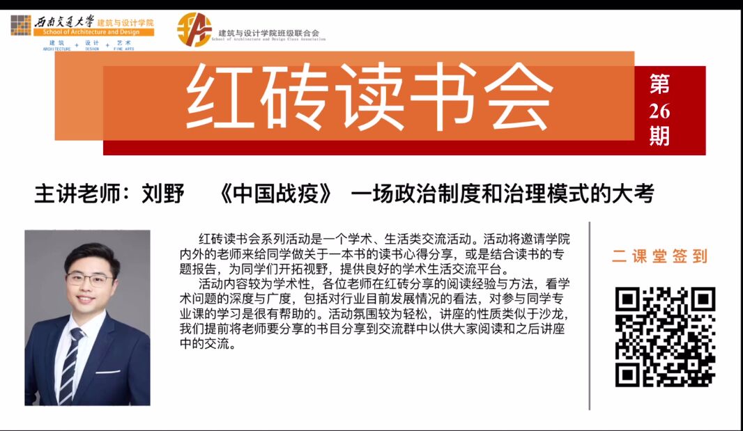 为了增强学生对国家抗疫的了解,感受新冠疫情下中国的经验积累和大国风范,2020年12月14日20:00,由建筑与设计学院主办,班级联合会会承办的“红砖”读书会第二十六期以线上的方式顺利举办,本次读书会邀请了布谷tv