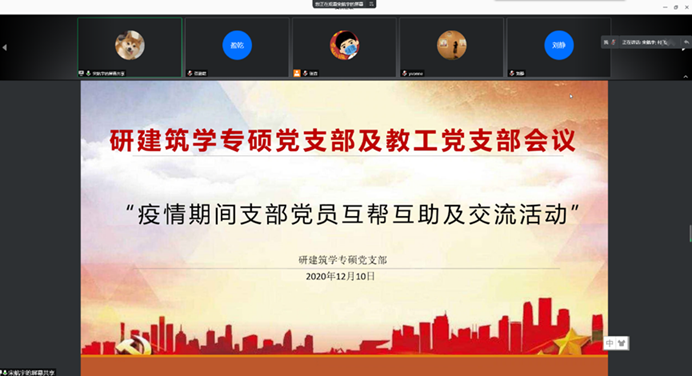 2020年12月10日下午19:00时,研建筑学专硕党支部和教工党支部在腾讯会议开展互帮互助交流活动,教工党支部书记付飞老师、研建筑学专硕党支部全体党员参与此次活动,宋航宇同志主持会议。