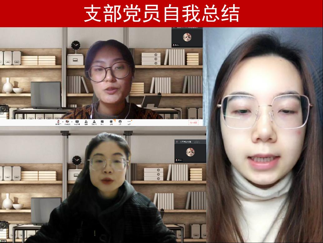 会议第二部分,支部党员、入党积极分子对自己2020年的学习与生活进行了总结和自我评价。研一支部副书记陈珏汶同志表示,2020经历了新冠疫情,毕业升学等诸多历练,她在一次次磨练中得到了成长。研二预备党员陈倩表示,2020年自己在思想上和学习上取得了不错的进步,但仍存在一些不足,还需要长期的学习和积累。研三入党积极分子孙雯同志回顾总结了自己2020年并展望了研究生生活的最后一学期,她希望能够做到习近平总书记所说的“志不求易者成,事不避难者进”,加强政治思想建设,坚定理想信念,积极向党组织靠拢,并做好班级毕业答辩辅助工作,为研究生生涯划上完美的句号!” 张弘毅、陈莹莹、戎尚、高爽、陈琪、冯旭环等多位同志都进行了自我总结。