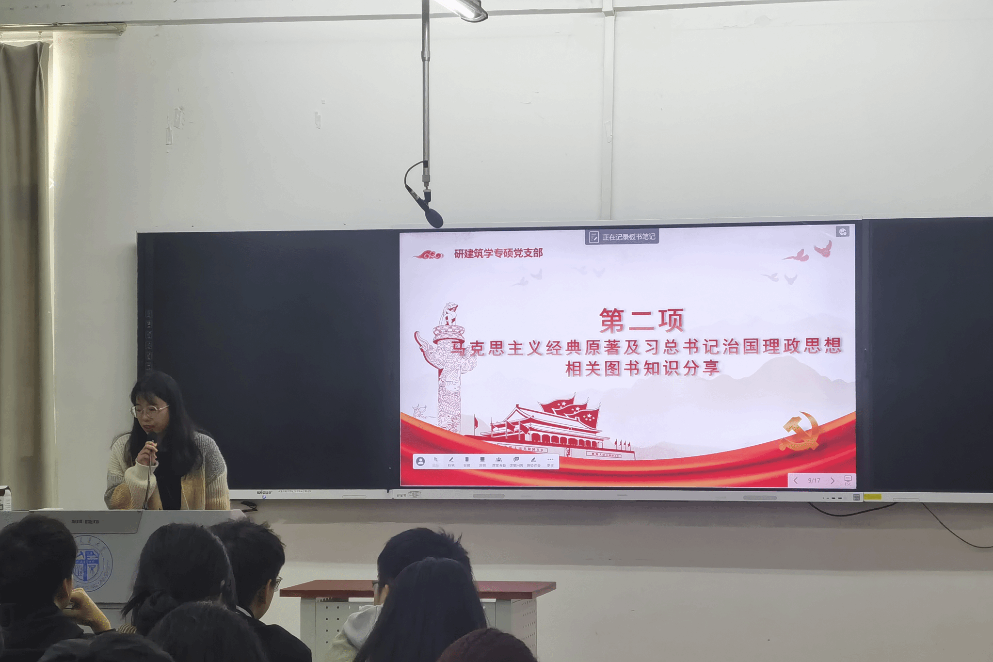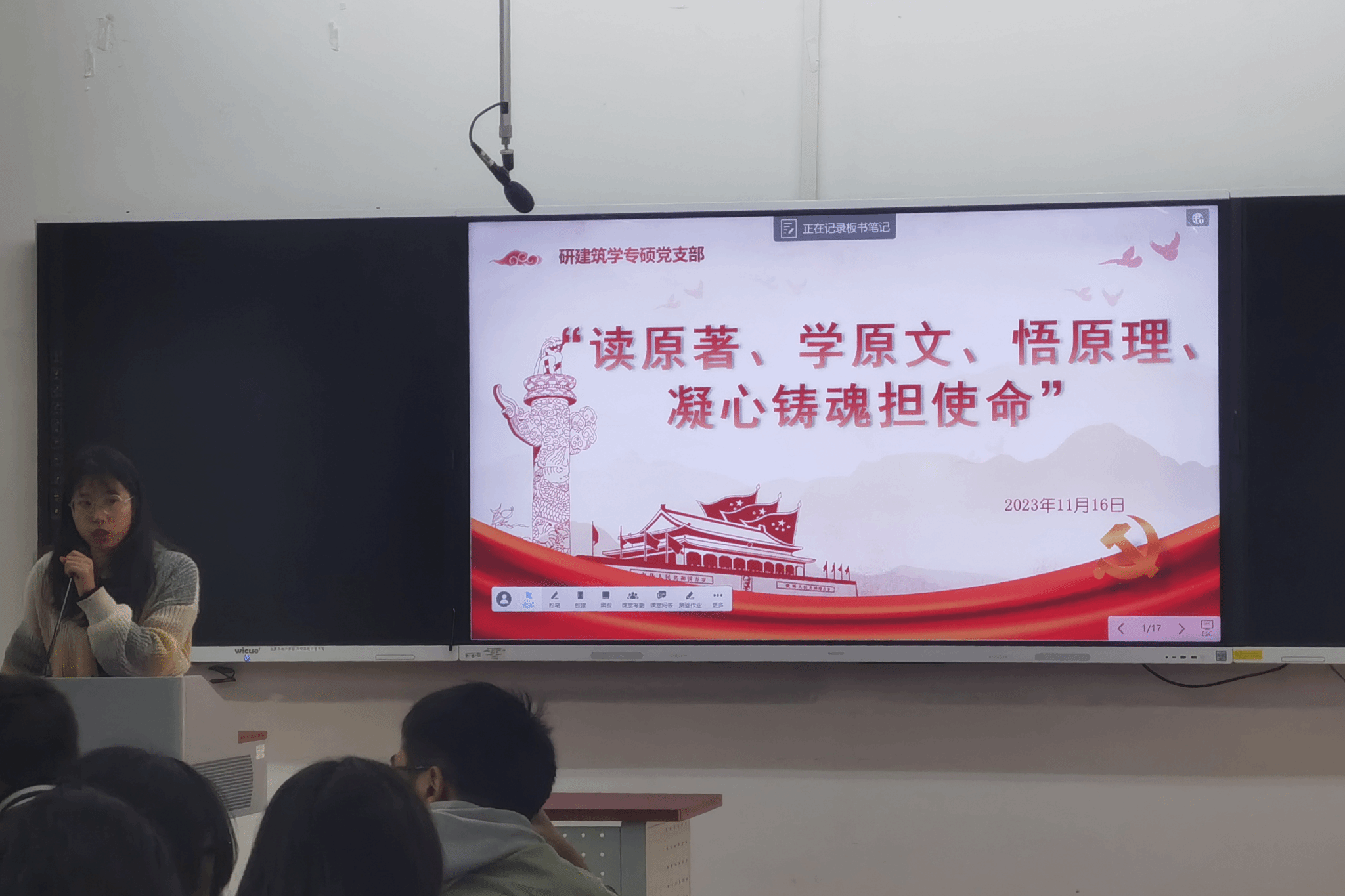 2023年11月16日16时至17时,研建筑学专硕党支部在X8323教室展开了“读原著、学原文、悟原理、凝心铸魂担使命”的组织生活会。本次组织生活会有四个环节,分别为:学习“读原著、学原文、悟原理”的重要性、“马克思主义经典原著及习近平总书记治国理政思想”相关图书知识分享、“交流与讨论”环节和“读原著、学原文、悟原理”活动介绍。本次活动由研建筑学专硕党支部委员谢仕菊同志主持,研建筑学专硕党支部全体党员和积极分子共同参加。