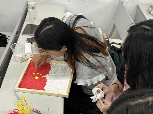 本次活动内容共三项。活动伊始,侯胜兰同志带领支部成员集中回顾了新中国成立75周年的根本成就,并学习了习近平总书记在全国民族团结进步表彰大会上的讲话。她强调,支部成员应以英雄模范为榜样,团结奋进、砥砺前行,以实际行动践行初心使命,为民族复兴伟业奉献力量。随后,为筑牢支部成员的党史知识,切身领悟新中国成立以来的光辉历程,支部以建党以来的30项重要历史事件作为竞赛的题目,开展了一场以“党史事件排序”为主要内容的趣味知识竞赛,支部成员纷纷展现出了扎实的理论功底。紧接着,支部进行了“共绘红色纸浆画”的彩绘活动,通过分组绘制红色纸浆画勾勒对新时代的热切期许与共同愿景。活动过程气氛热烈,支部成员用绚烂的色彩表达了自己对党和祖国的诚挚祝福。