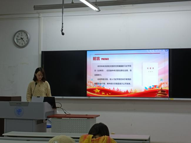 活动第一项,许倩同志介绍了习近平同志《论教育》中收录文稿的主要内容,并分析了这部专题文集的政治意义、理论意义和实践意义。随后,各位同志踊跃举手、积极发言,根据会前自主学习的内容,交流分享各自的学习体会。