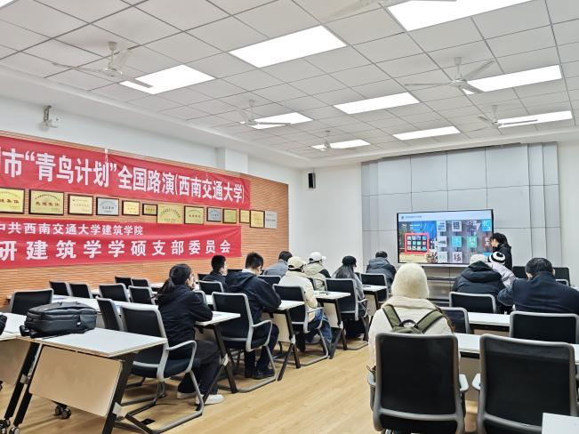 犀浦校区四食堂321教室开展山东省滨州市“青鸟计划”全国路演、人才政策及实习就业推荐活动,该活动为共青团滨州市委主办,旨在推动四川省大学生了解山东省“青鸟计划”,拓宽信息面,了解多省市人才引进政策,同时促进支部党员同志高质量就业。