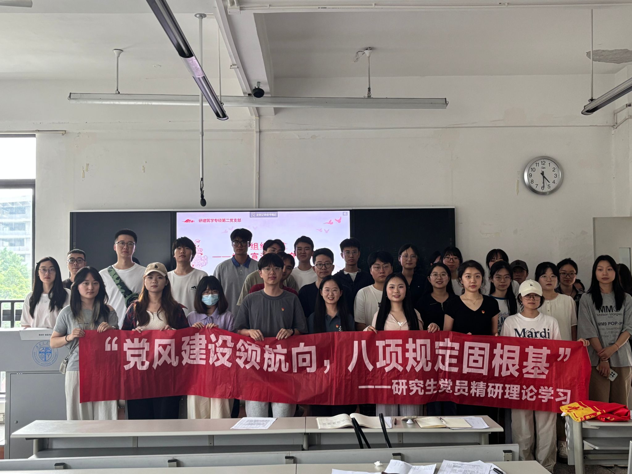 为深入贯彻中央八项规定精神学习教育,进一步加强党的作风建设,2025年6月6日17时至18时,研建筑学专硕第二党支部在X8323组织开展了以“组织领航——党风宣讲凝聚奋进共识”为主题的“领航先锋”工程系列党日活动。本次活动由研建筑学专硕第二党支部支委会成员杨忻睿同志主持,支部全体党员与积极分子共同参与了本次党日活动。