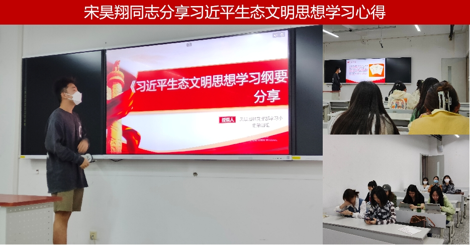 随后,宋昊翔同志讲述了习近平生态文明思想的相关内容,并结合风景园林专业、“人与自然和谐共生”理念及生态文明知识,引入海绵城市治理的案例介绍,生动地阐述了“共谋绿色生活,共建美丽家园”的深刻内涵。